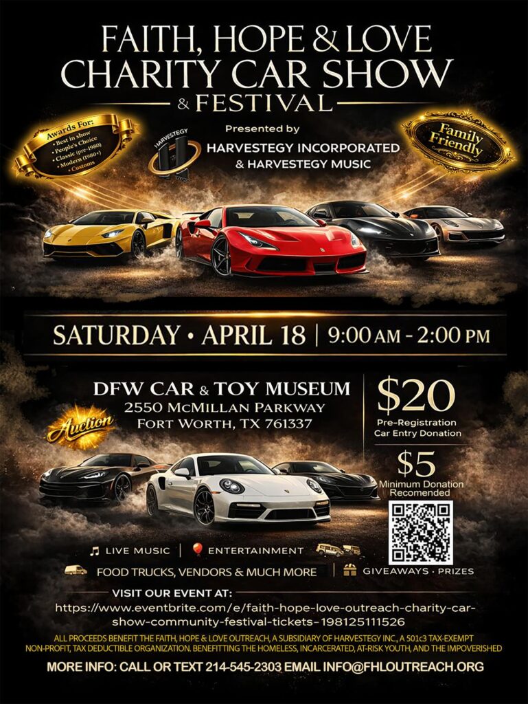 Join us for an unforgettable day of cars, community, and compassion at the Faith, Hope & Love Outreach Charity Car Show & Community Festival on April 18 at the DFW Car and Toy Museum in Fort Worth, TX!